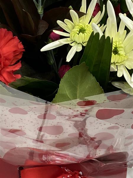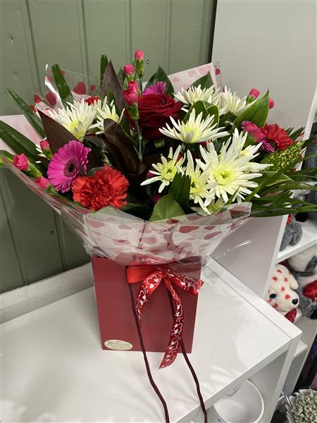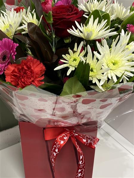 A Luscious Hand Tie combining, one Red Rose in the centre with a mix of Cerise Spray Carnation, Red Carnation, Cerise Pink Germini and White Delianne Chrysanths.