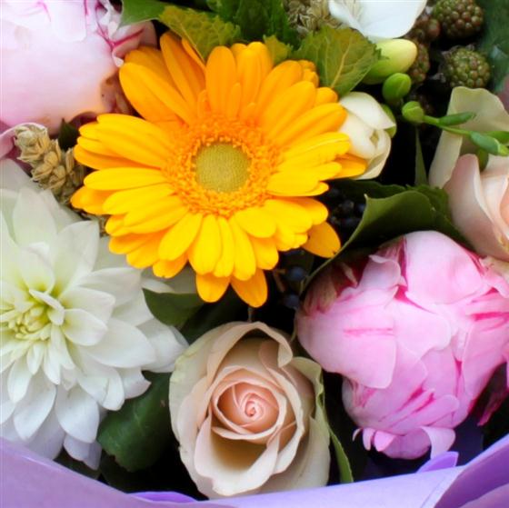 A beautiful domed hand tied bouquet in summery colours, with unusual and seasonal foliages and fillers. Delivered in water, this is sure to brighten up someones day!